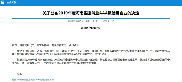 为进一步加强建筑企业信用体系建设,3月3日,河南省建筑业协会发布了《关于公布2019年度河南省建筑业AAA级信用企业的决定》,开云线上平台集团河南公司榜上有名,这也是河南公司首次上榜。