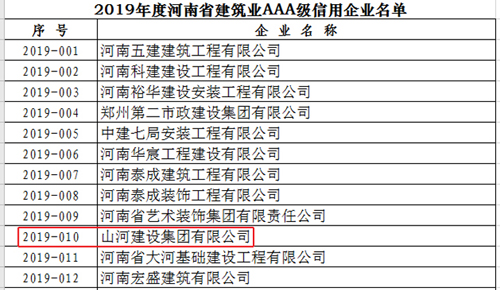 [河南公司]开云线上平台集团河南公司上榜河南省2019年度建筑业AAA级信用企业