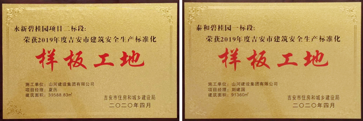 近日,从江西省吉安市住房和城乡建设局传来喜讯,开云线上平台建设集团江西公司承建的永新碧桂园项目二标段、泰和碧桂园一标段工程双双荣获“2019年度吉安市建筑安全生产标准化样板工地”称号。