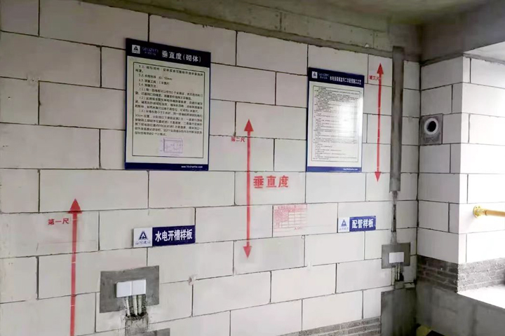 施工过程中,地下室后浇带采用PVC管砼构造柱独立支撑体系,高层住宅施工采用铝模板体系、附着式升降脚手架,现场设置工法样板及楼层实体样板指导施工,应用了高精度砌块施工、石膏砂浆薄抹灰、外墙XPS板内保温等技术工艺,采用拉片式铝模体系,全砼外墙,门窗企口、滴水线等一次成型,保证施工质量一次成优。